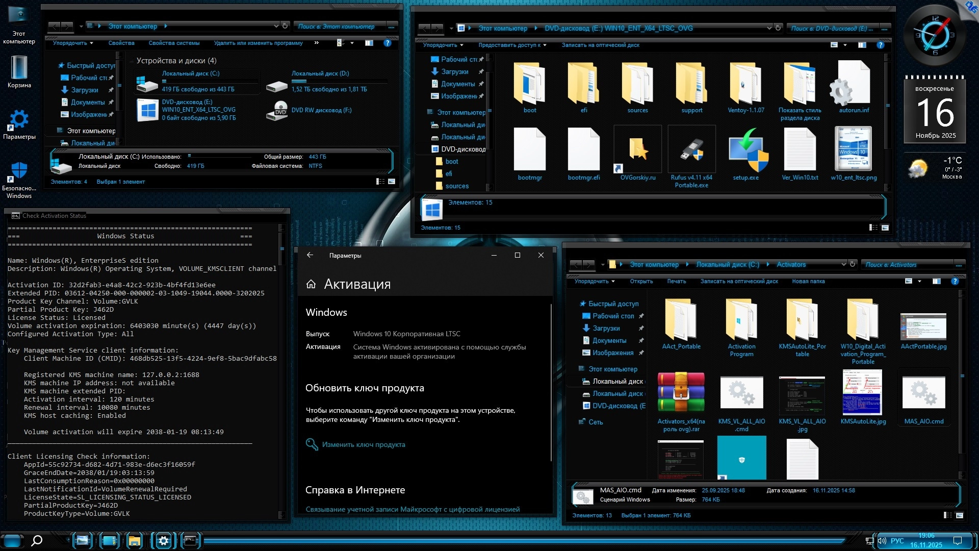 • Операционная система и Офис 2016 автоматически активируются в процессе установки. Если по каким то причинам этого не произошло, то после установки ОС на системном диске создастся папка "Activators", где вы сможете найти подборку инструментов для активации системы и офиса. Рекомендую воспользоваться автоматическим KMS активатором KMSAuto Lite Portable. Обязательно отключайте защитник или другой антивирус при активации и при создании флешки. Возможно активаторы ещё понадобятся